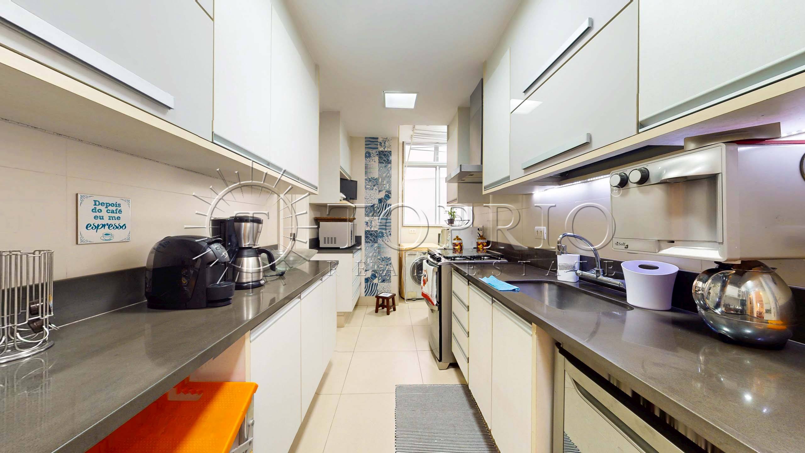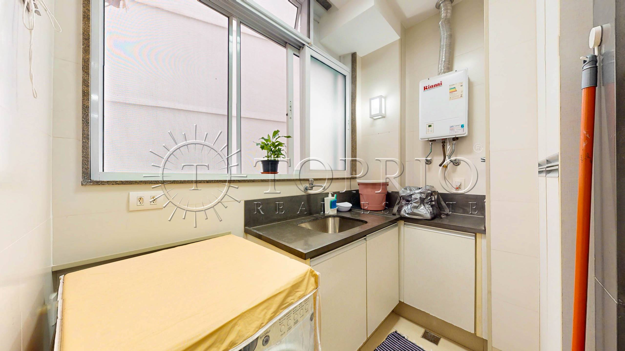 Enquanto isso, a cozinha oferece boa área de circulação, armários planejados, espaço para fogão com coifa e bancadas que facilitam a organização. Em anexo, a lavanderia também conta com armários e uma dependência completa para funcionários, o que agrega ainda mais valor ao imóvel.