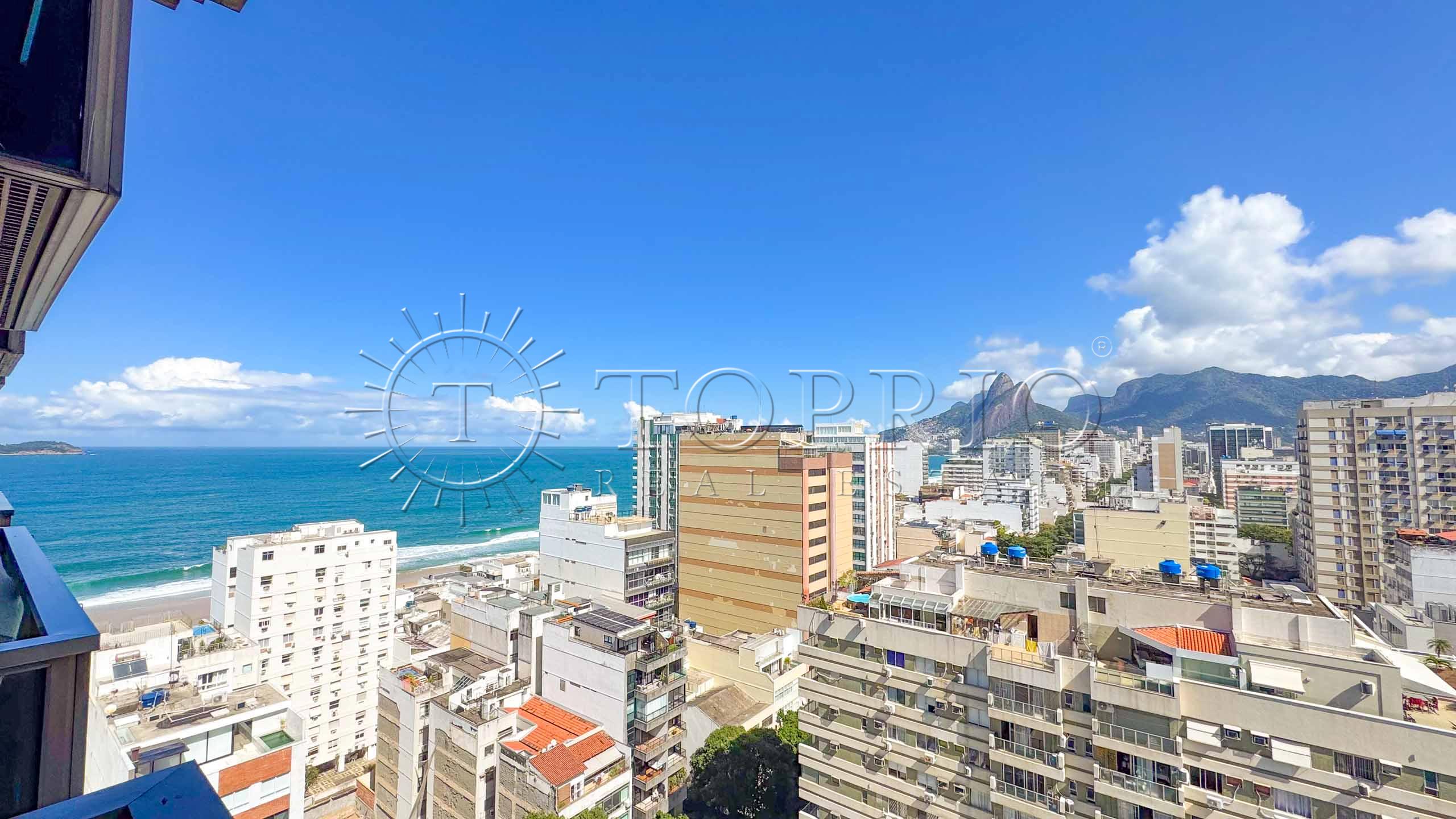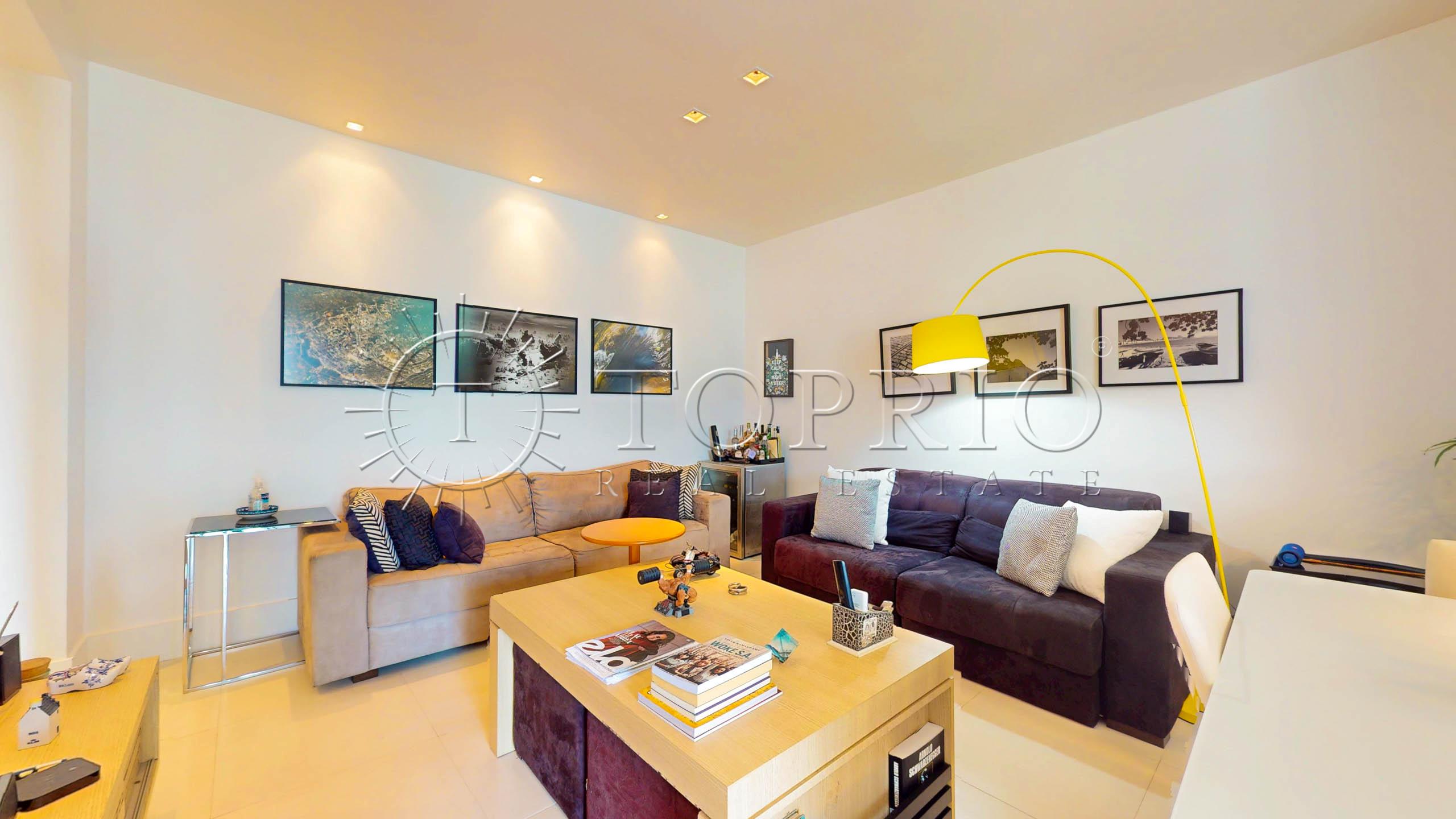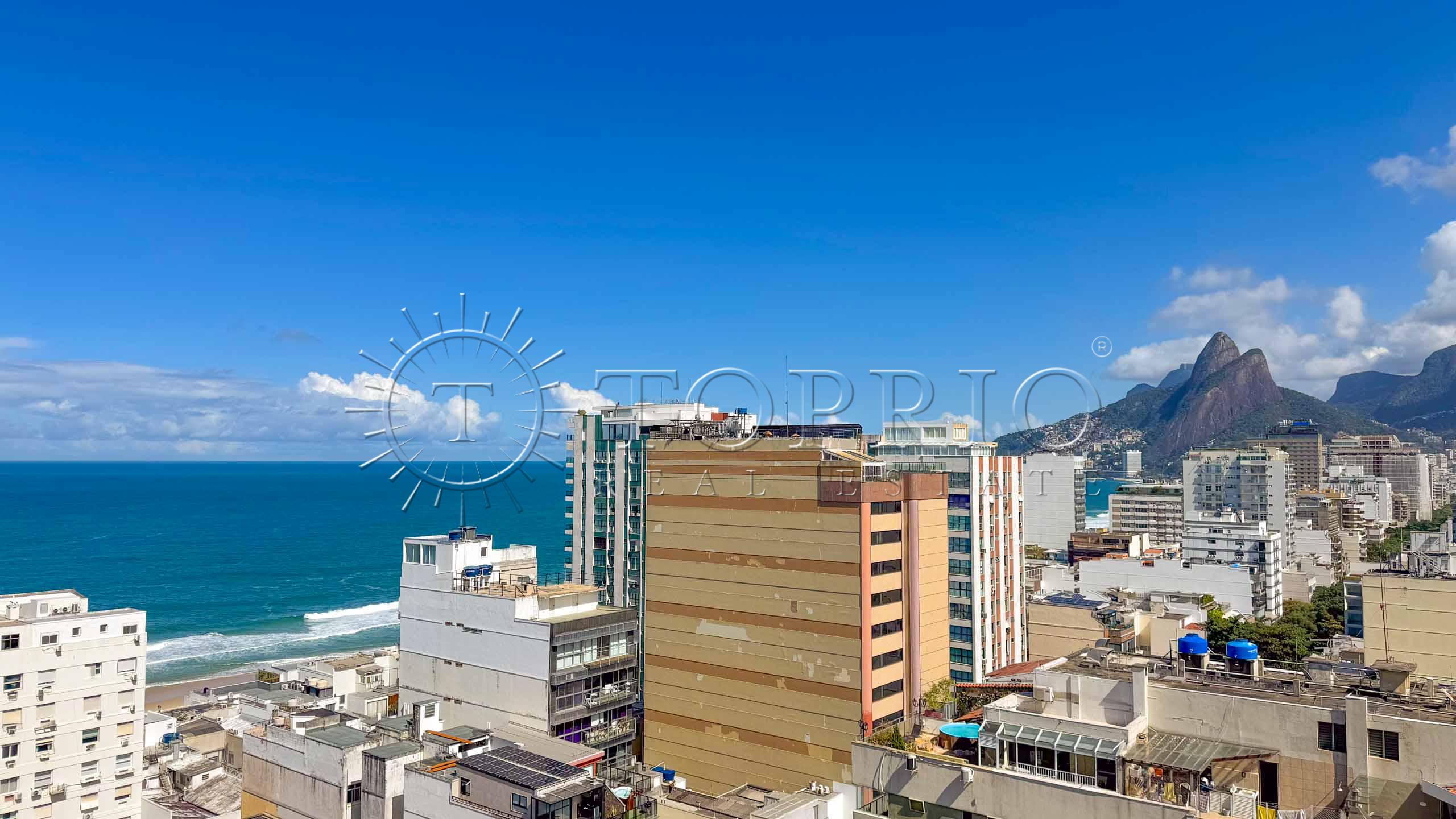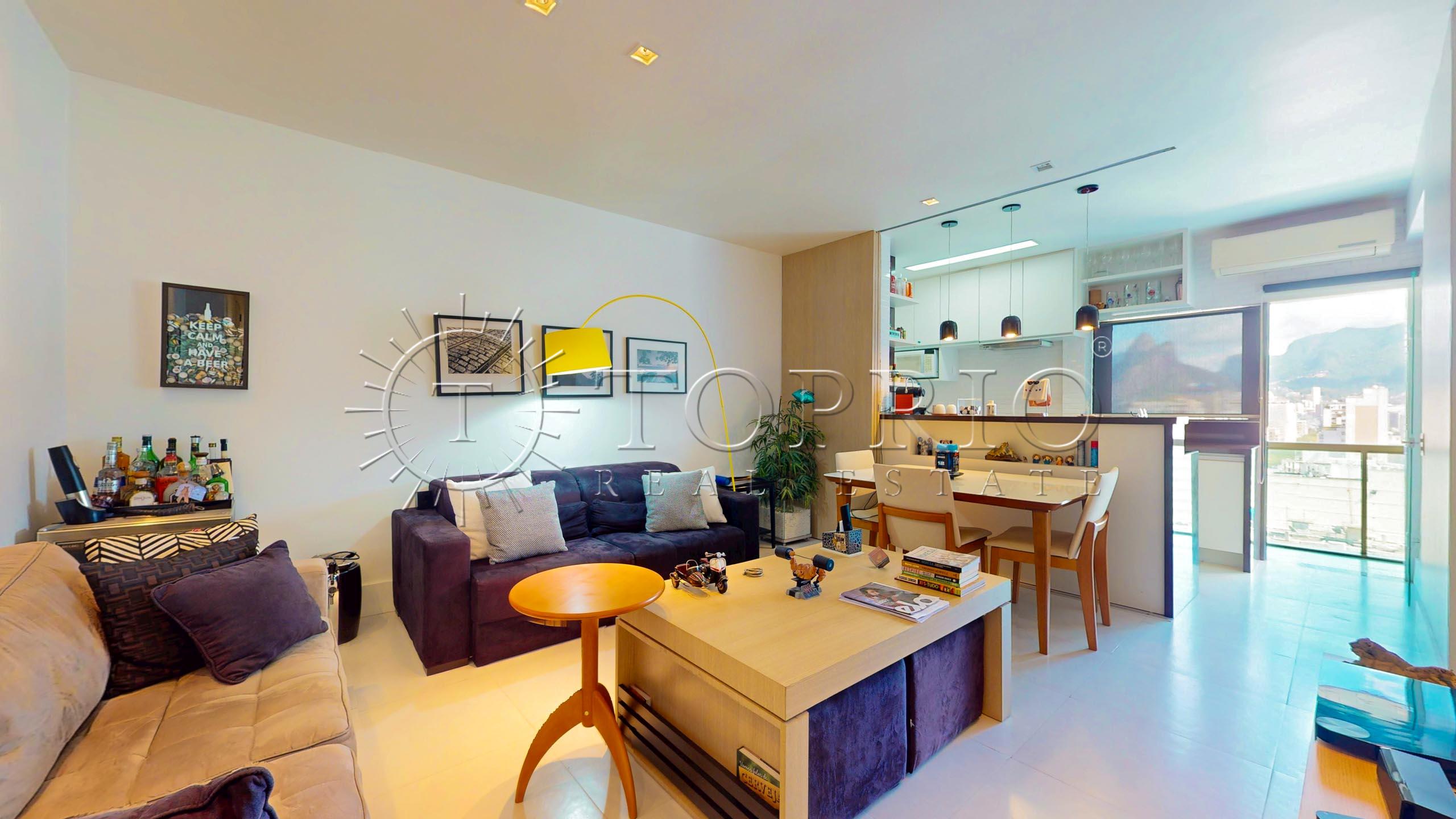 🛋️ Na área social, temos uma sala de estar com cozinha integrada, trazendo praticidade ao dia a dia 🧠. O ambiente conta com varanda com vista lateral para o mar 🌊, Morro Dois Irmãos 🗻 e Cristo Redentor ✝️, além de ótima iluminação ☀️ e ventilação natural 🍃.