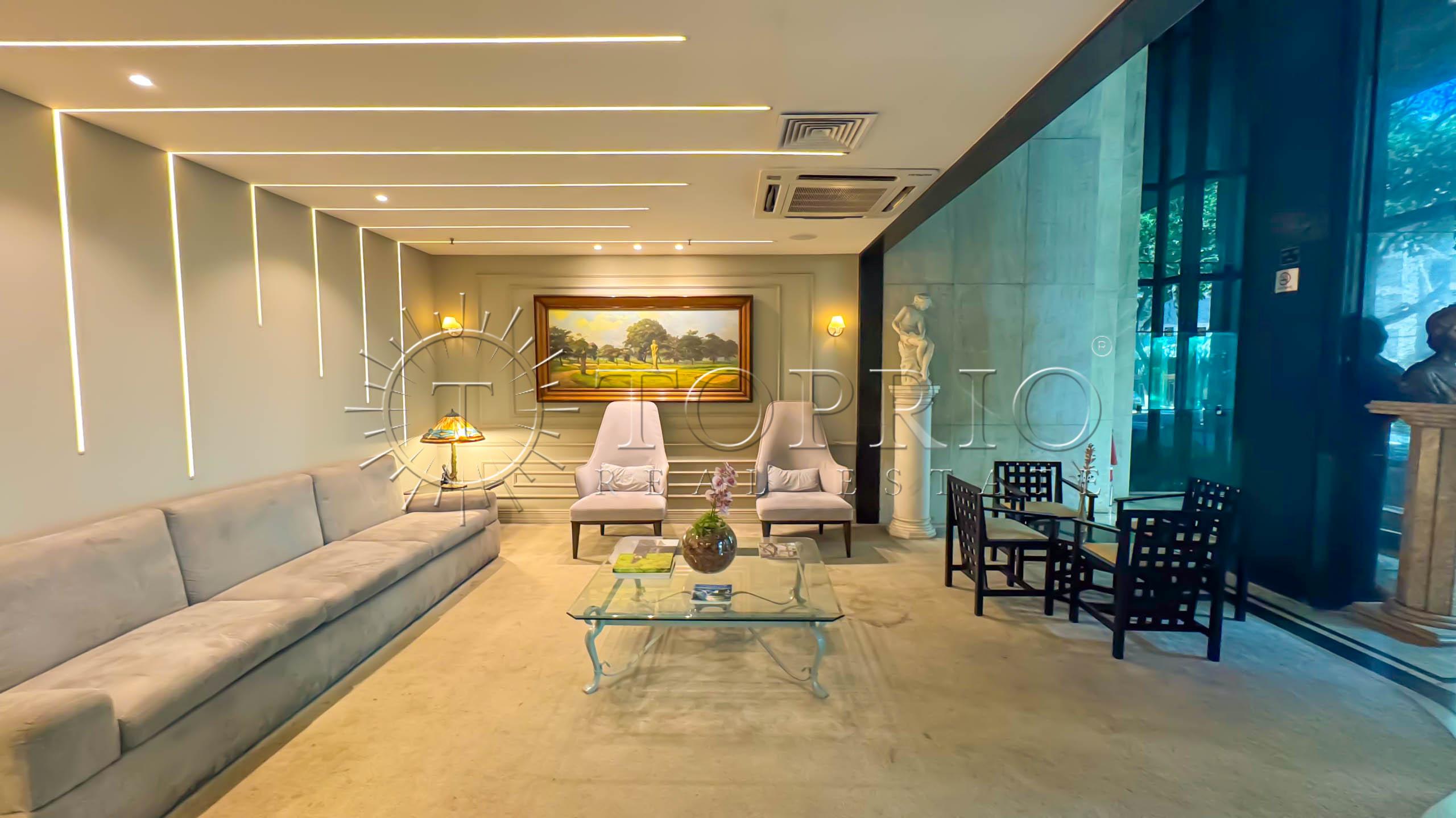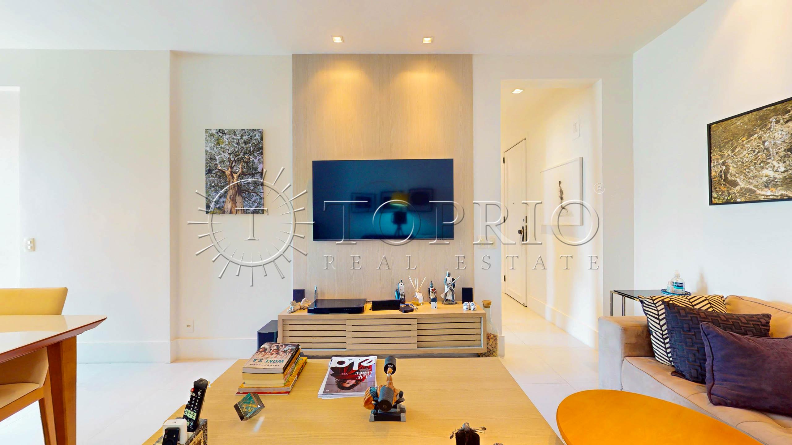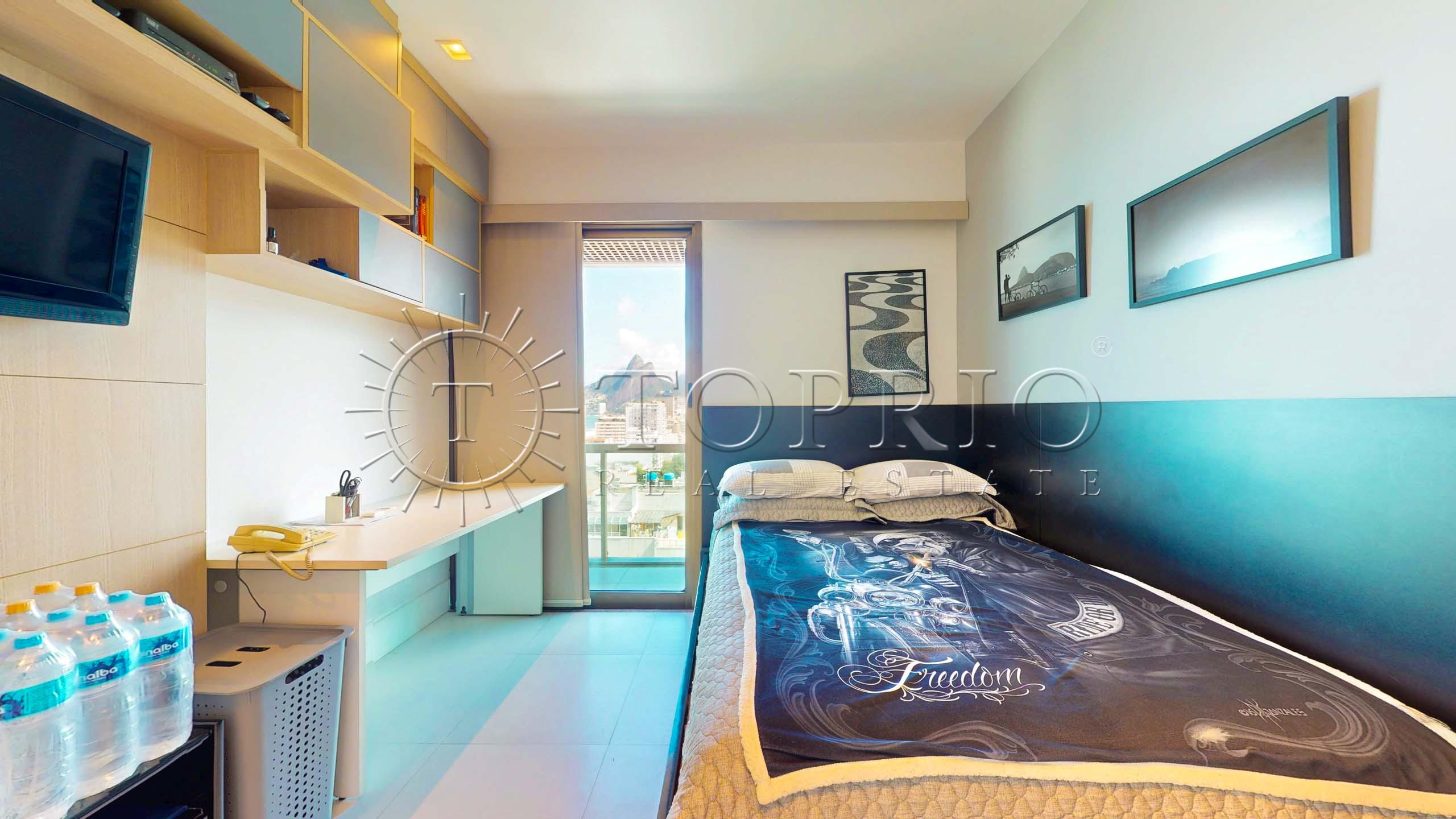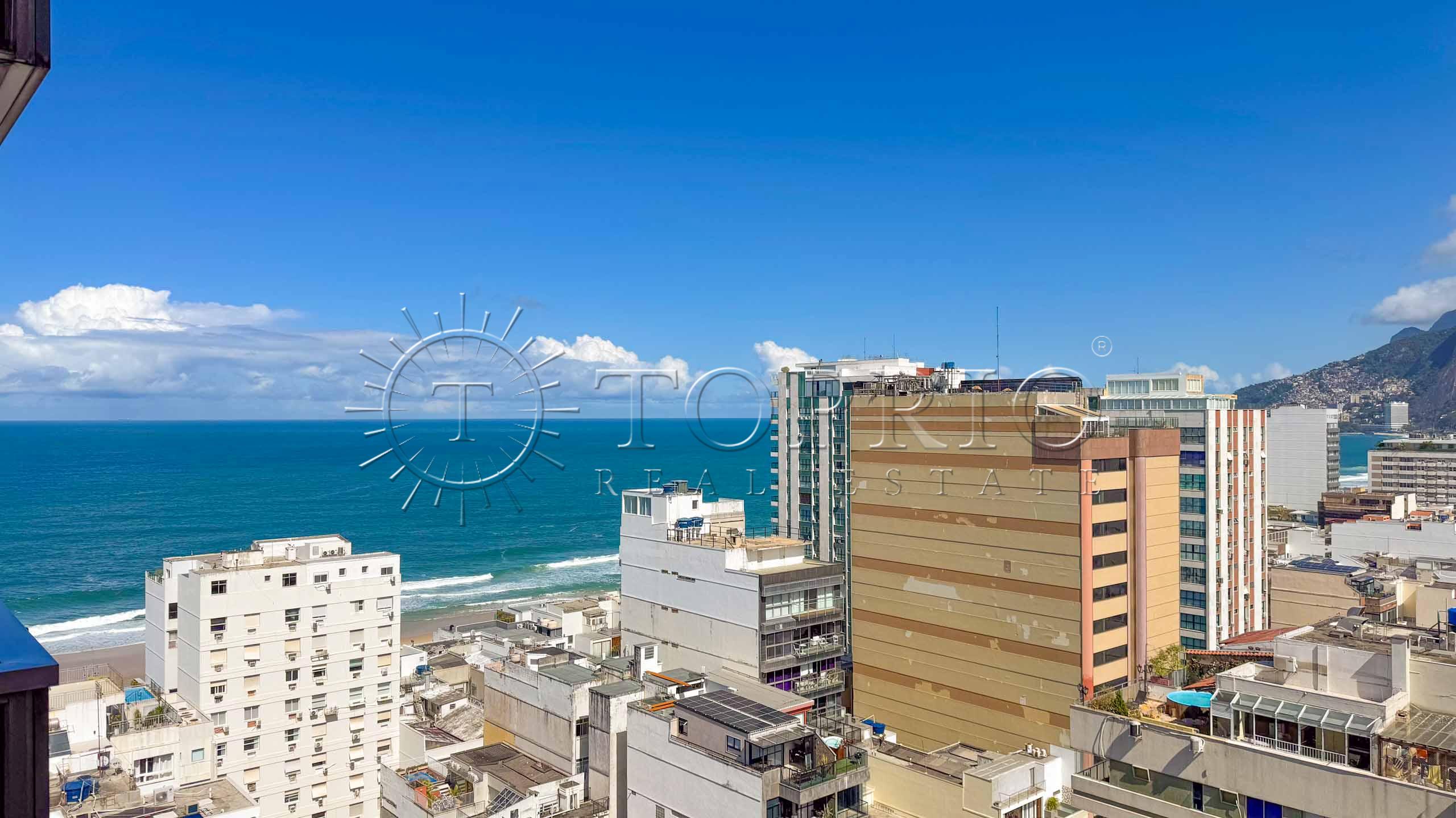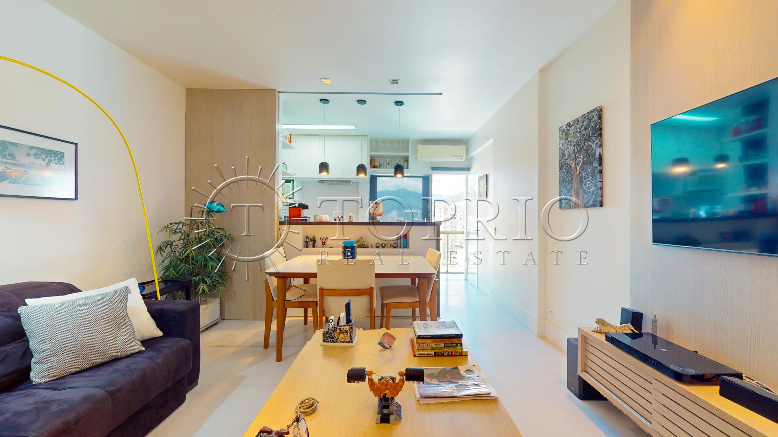 🛋️ Na área social, temos uma sala de estar com cozinha integrada, trazendo praticidade ao dia a dia 🧠. O ambiente conta com varanda com vista lateral para o mar 🌊, Morro Dois Irmãos 🗻 e Cristo Redentor ✝️, além de ótima iluminação ☀️ e ventilação natural 🍃.