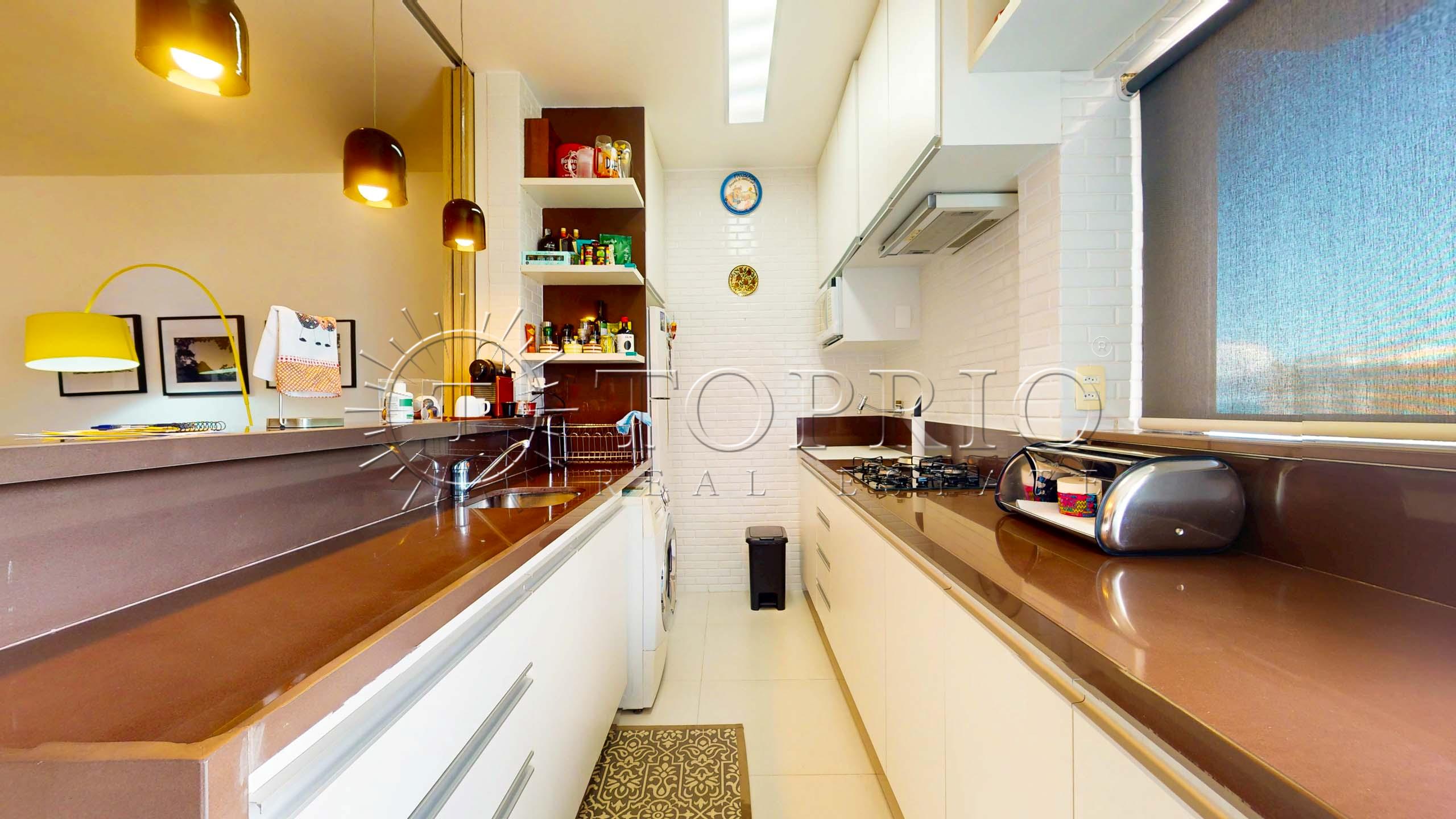 👨‍🍳 A cozinha é arejada, ligada à sala, com armários planejados, bancada ampla e cooktop 🔥. A lavanderia está integrada, com espaço para máquina lava e seca 🧼.