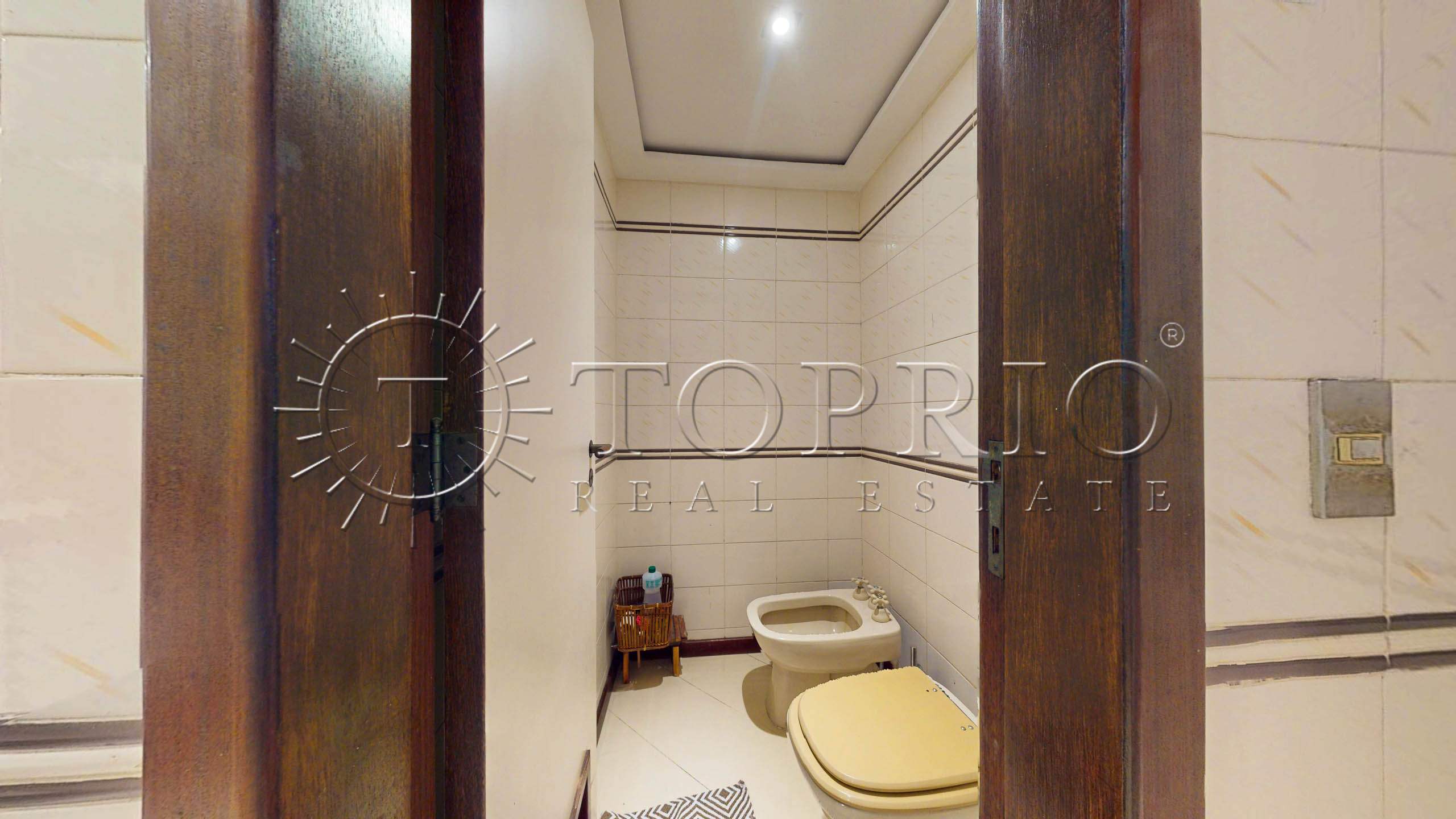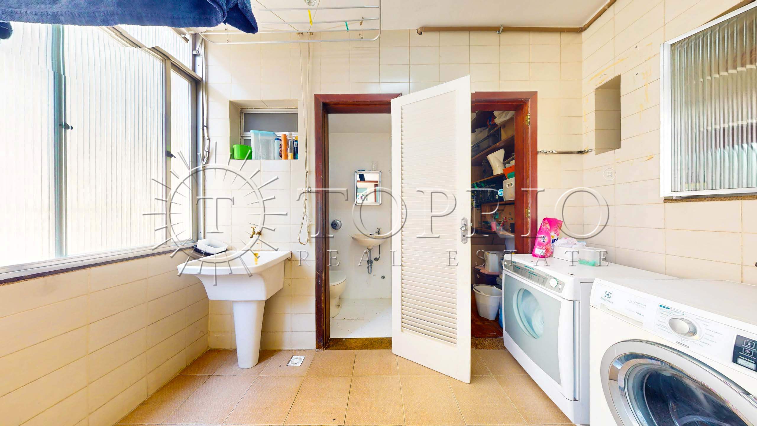 A área de serviço, totalmente independente, inclui armários extras e duas dependências completas para funcionários, o que amplia as possibilidades de uso e facilita a rotina doméstica.