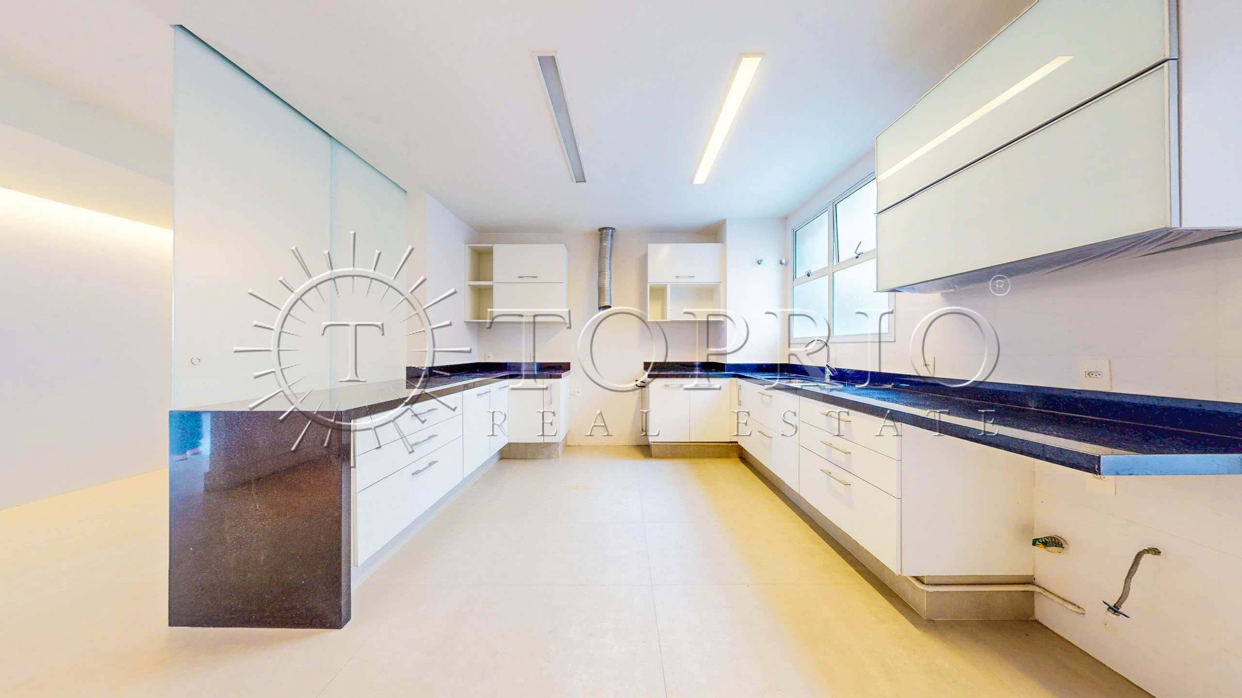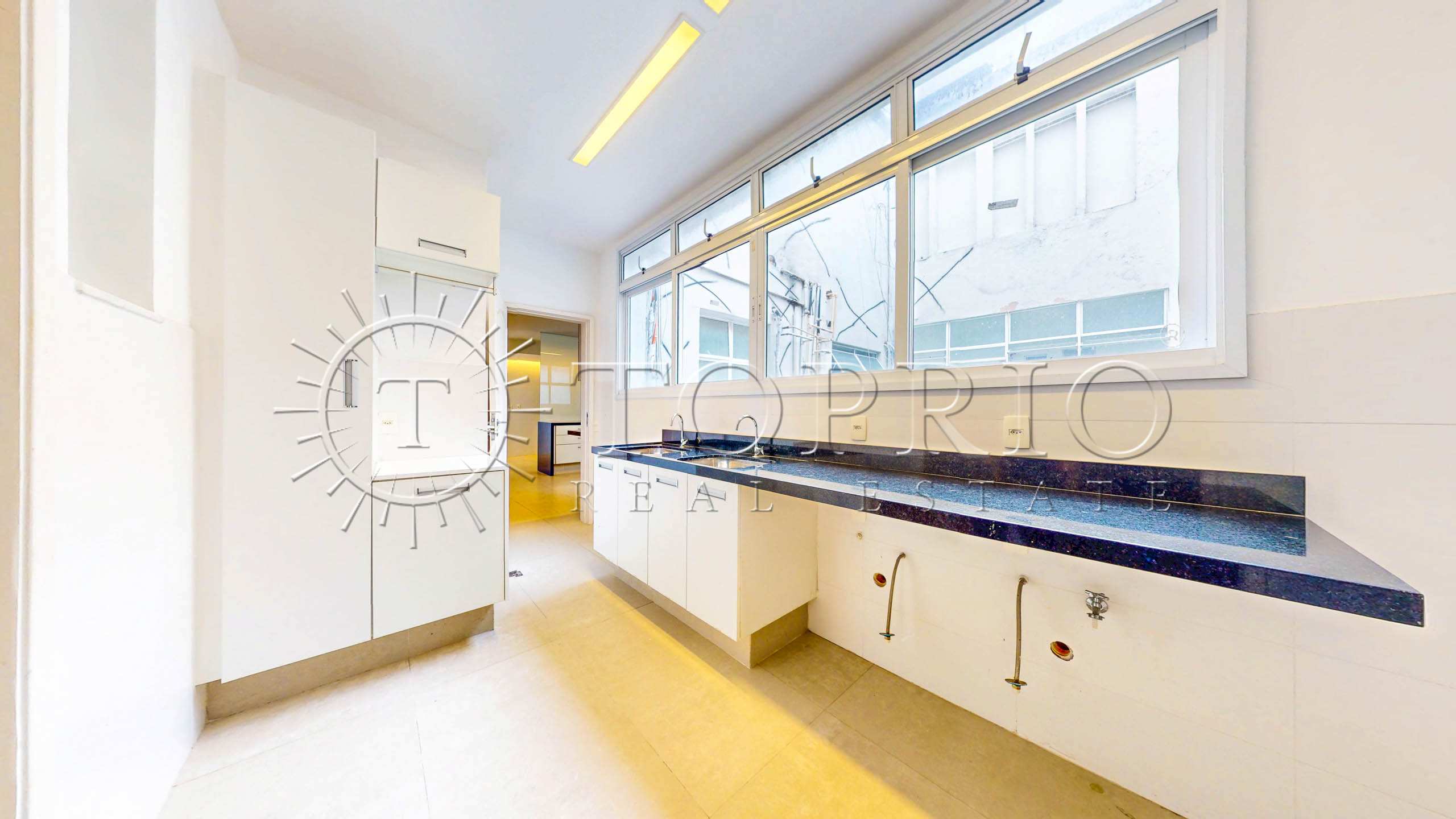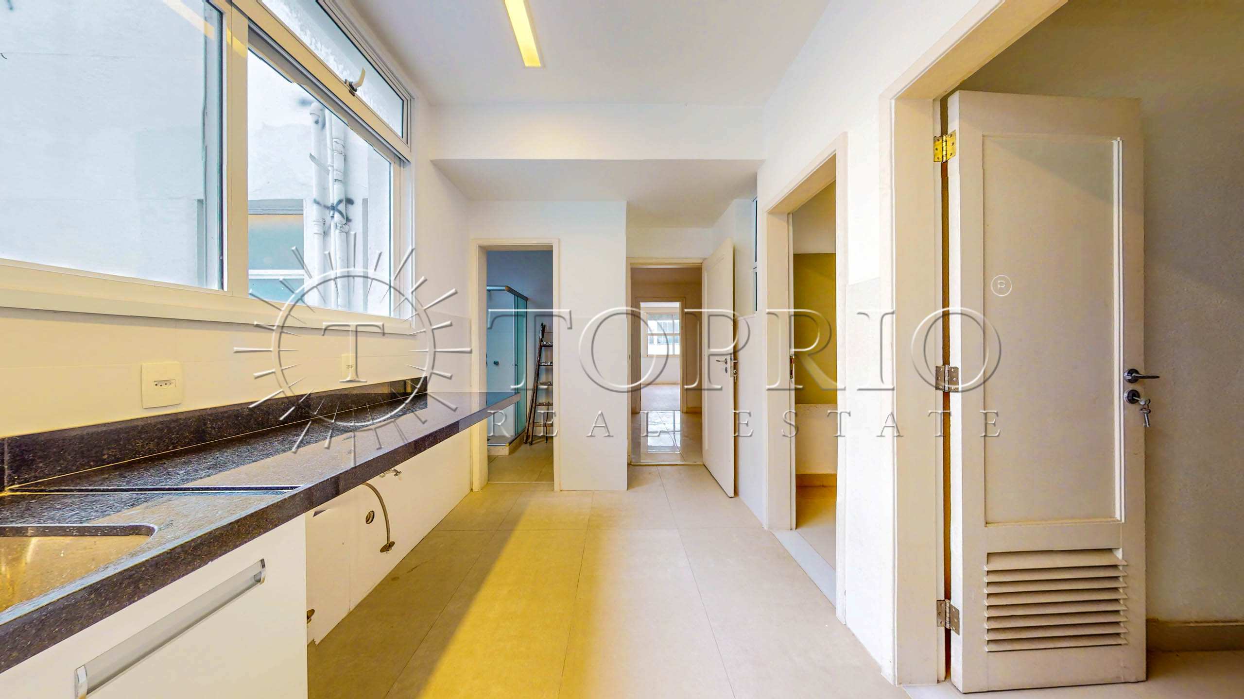 A cozinha é generosa, com área de copa para o uso diário, diversas bancadas e armários planejados. Em anexo, ficam a área de serviço e duas dependências completas para funcionários, o que amplia as opções de organização e apoio.
