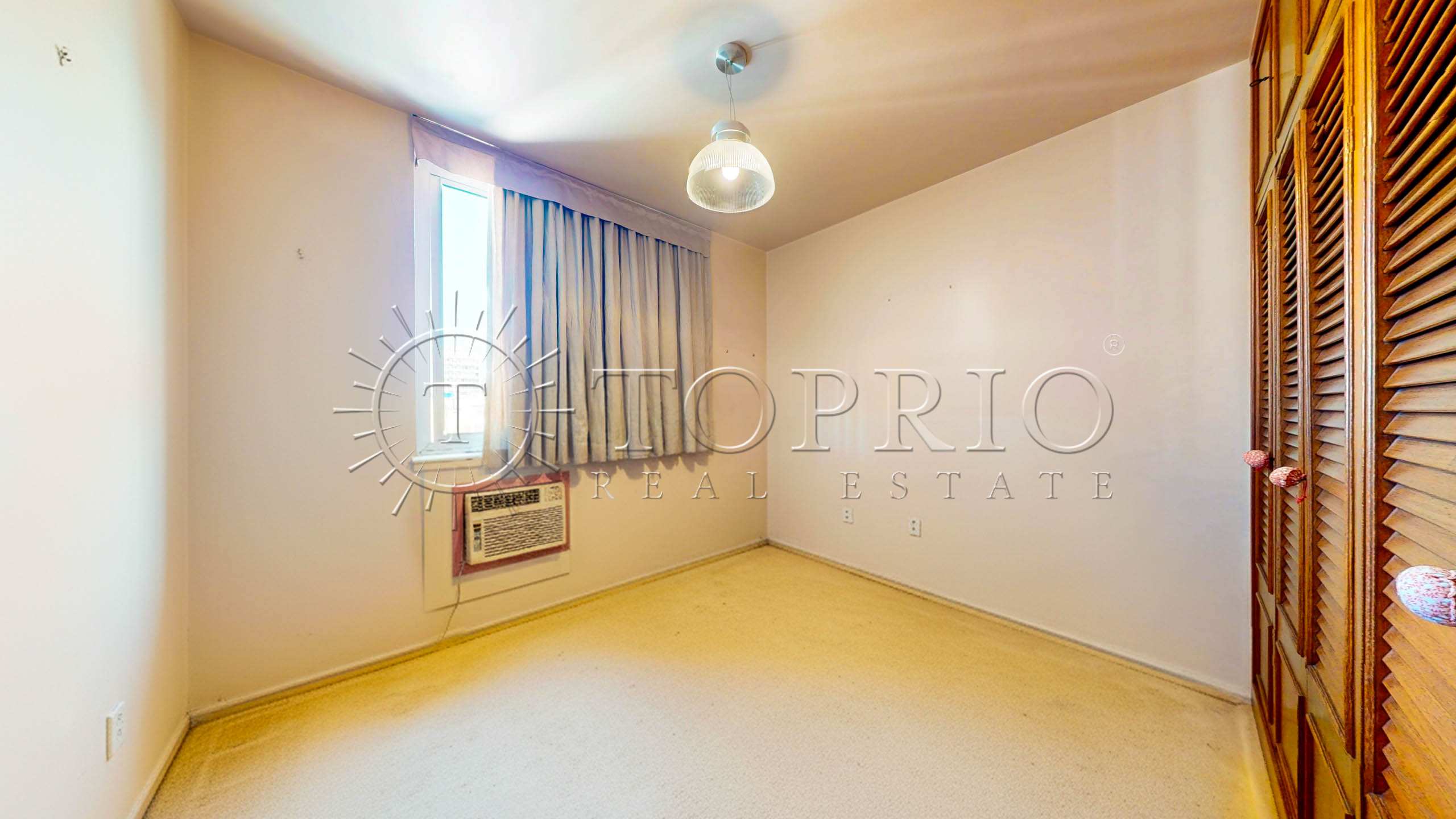 São três quartos, sendo uma suíte. Todos têm armários embutidos e ar-condicionado. O piso original em madeira está preservado sob o carpete atual.
