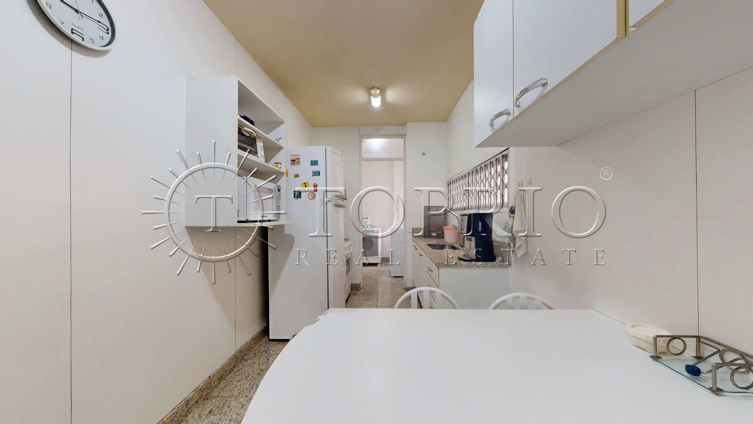 A cozinha apresenta layout funcional, com armários planejados, bancadas de apoio e mesa para pequenas refeições, o que facilita a rotina diária. Em seguida, a planta integra a área de serviço e a dependência completa para funcionários, agregando organização e funcionalidade ao imóvel.
