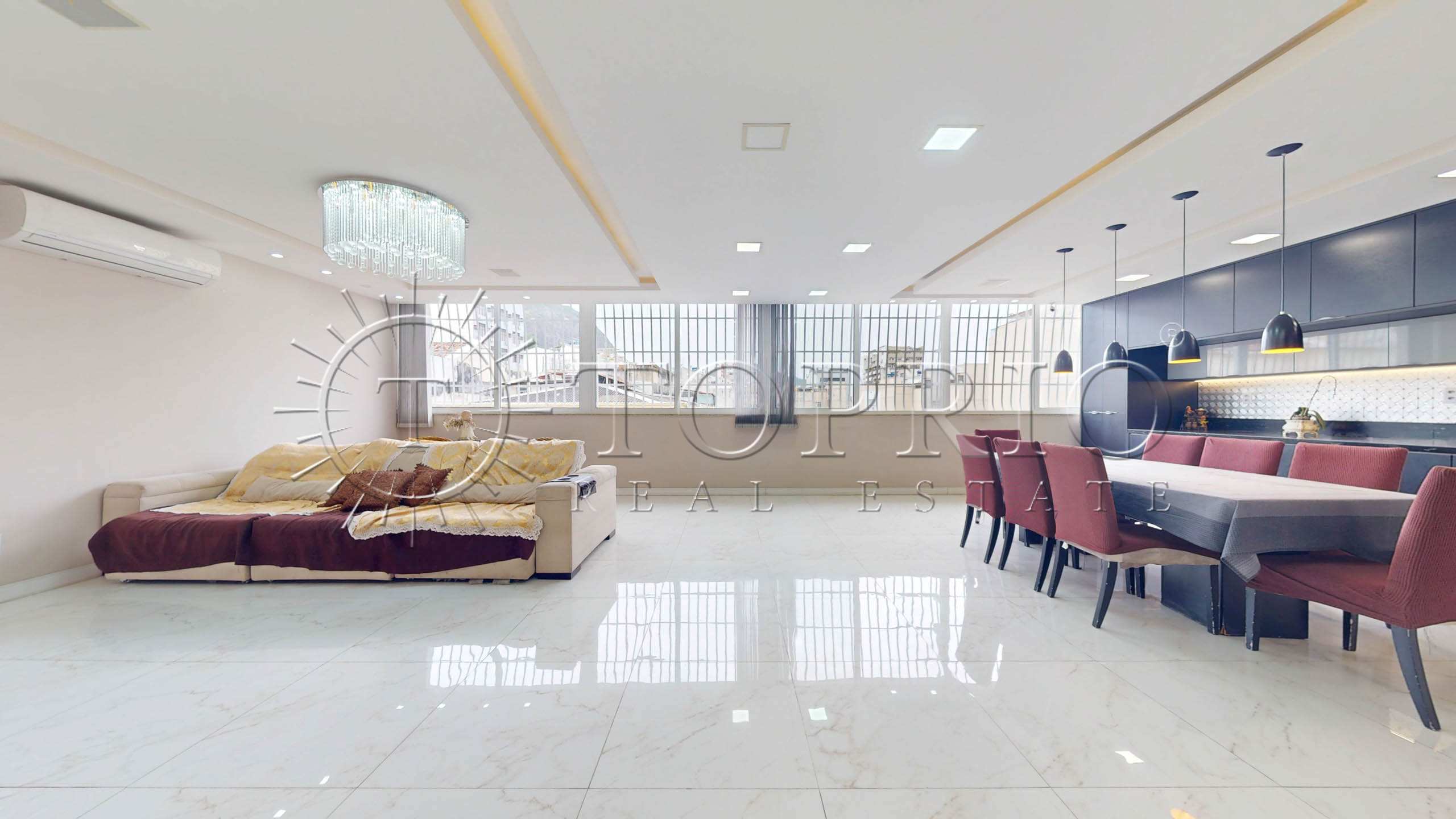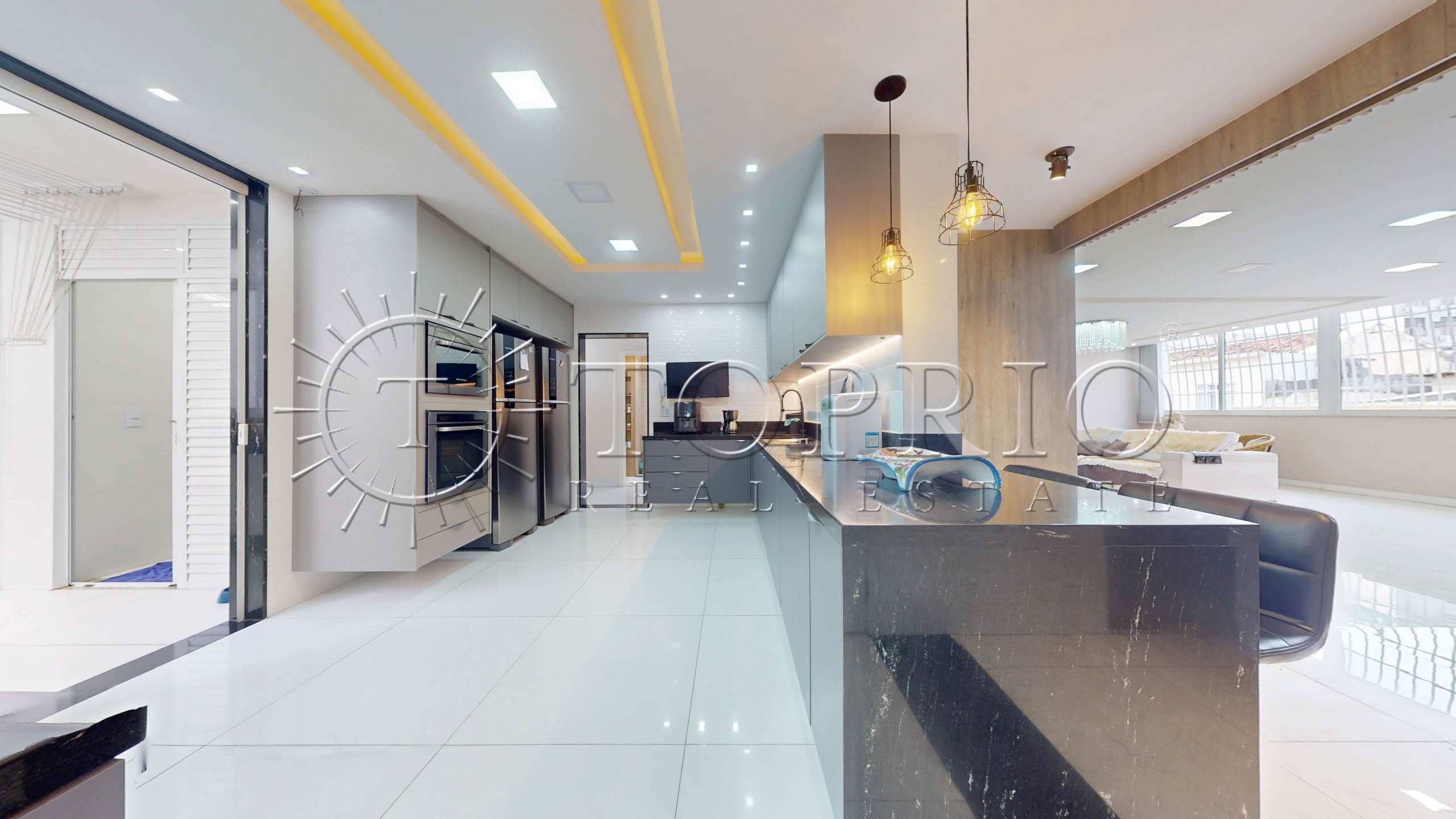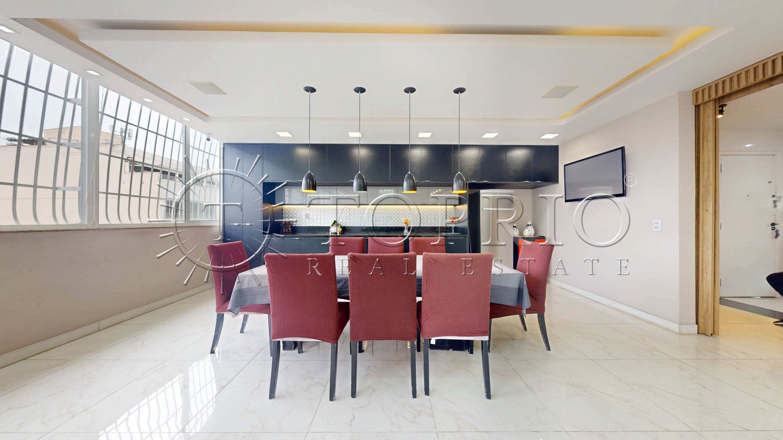 - Ao entrar, você encontra uma sala extensa com 3 ambientes: estar, jantar e bar de apoio.