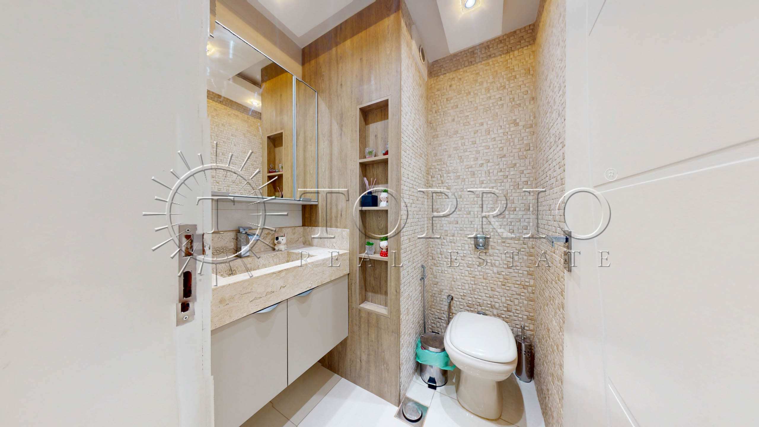 - Um banheiro social moderno completa a área íntima.