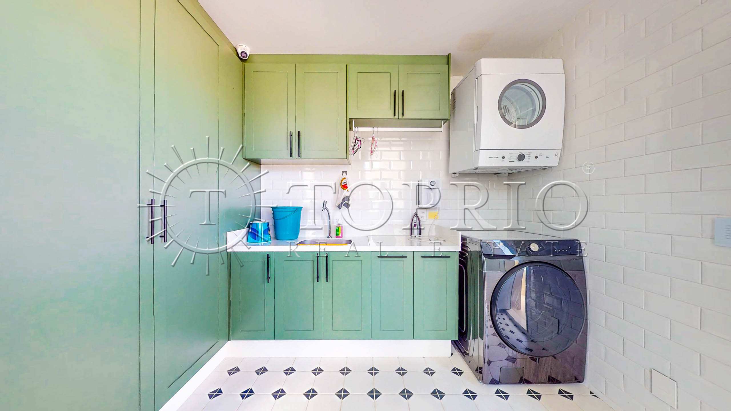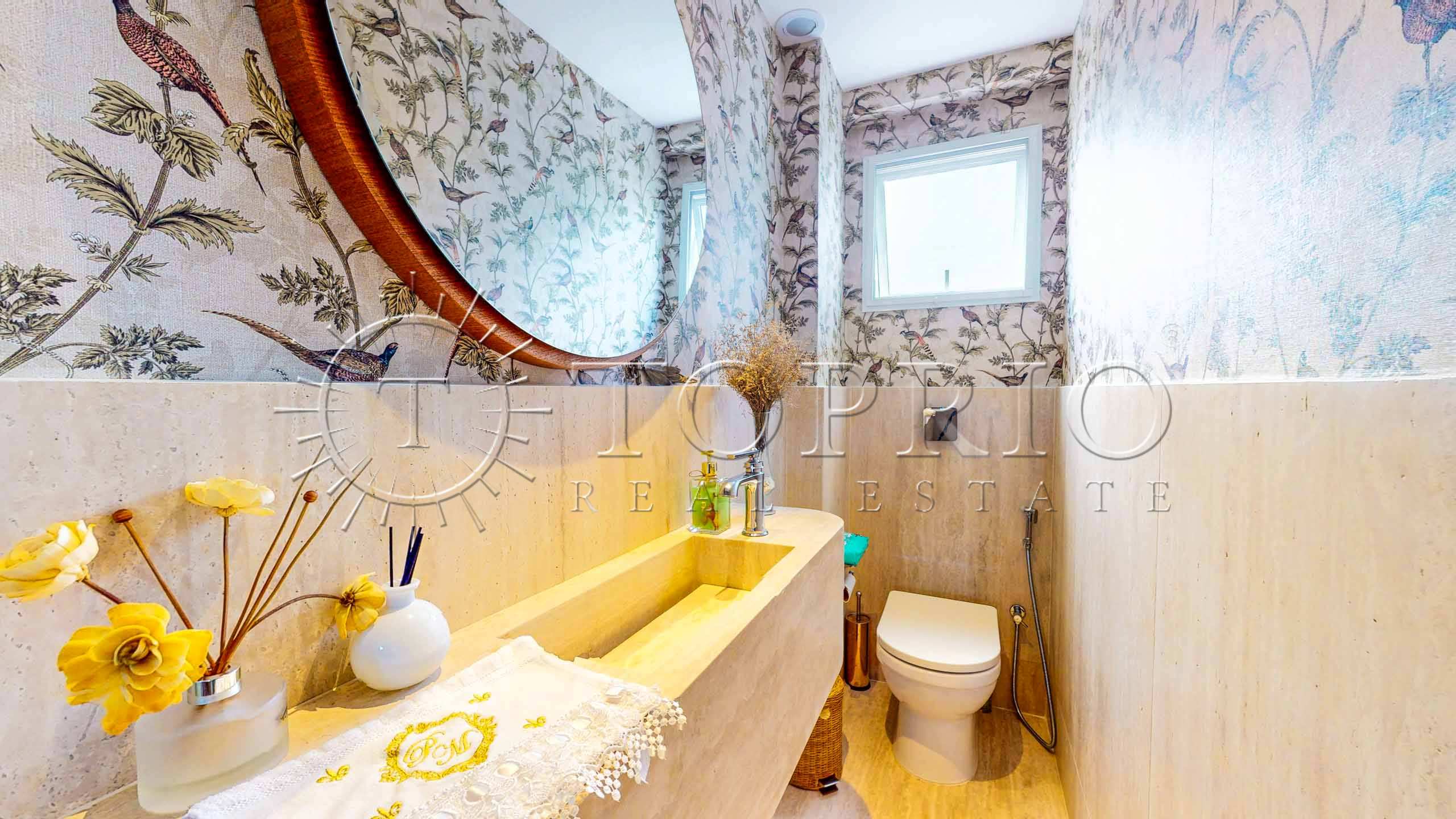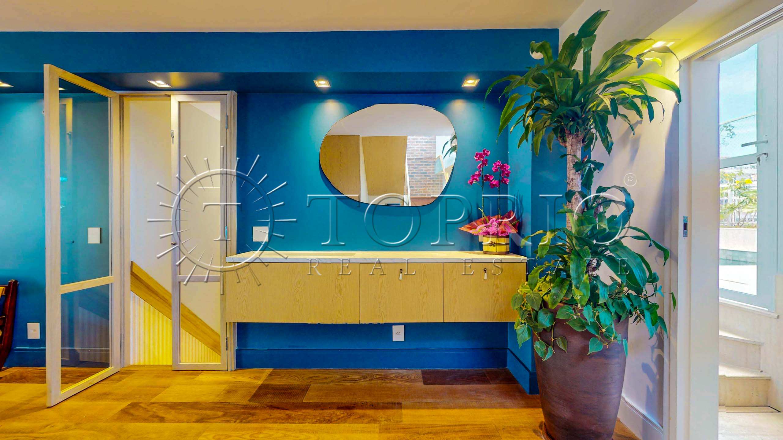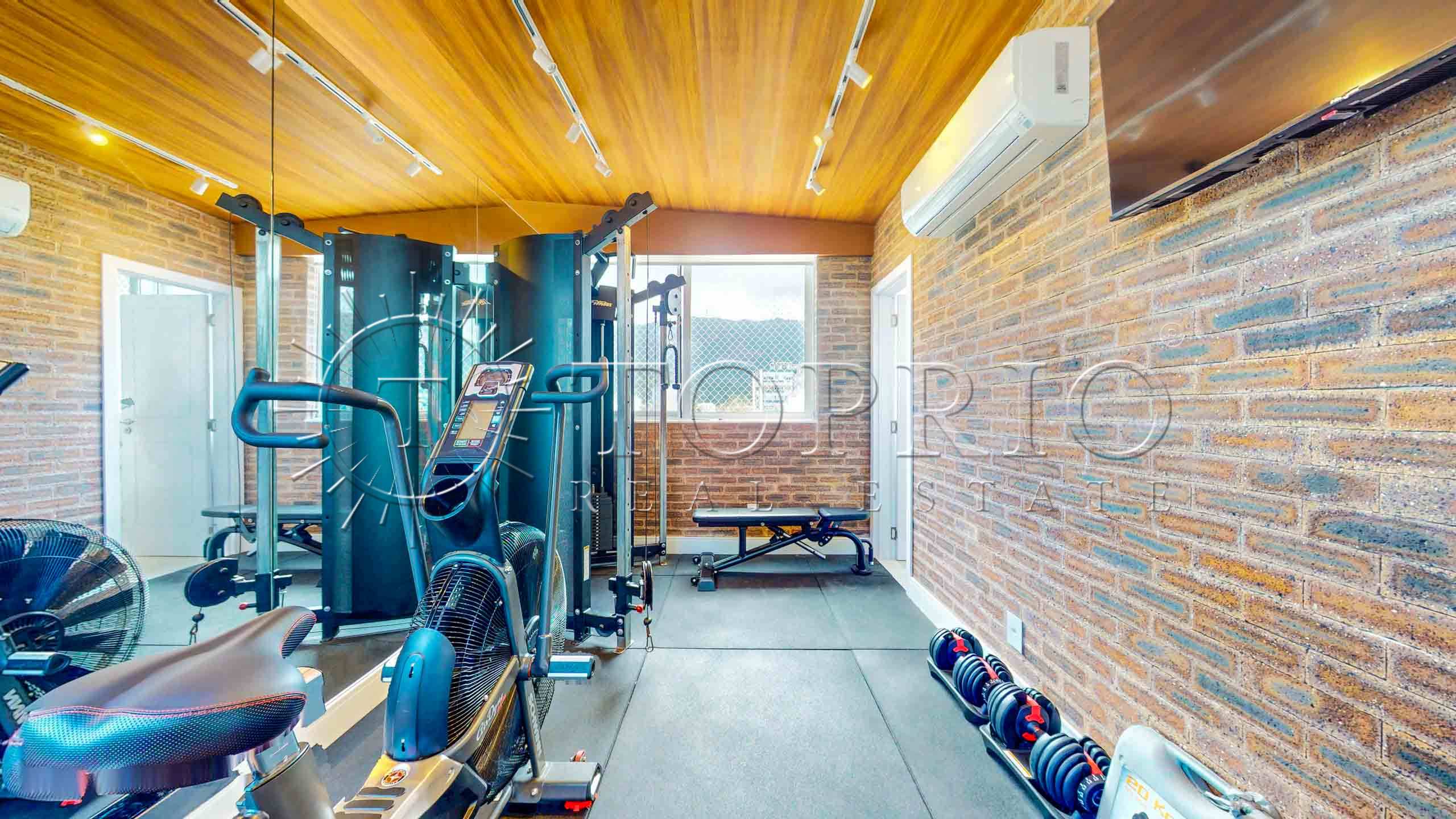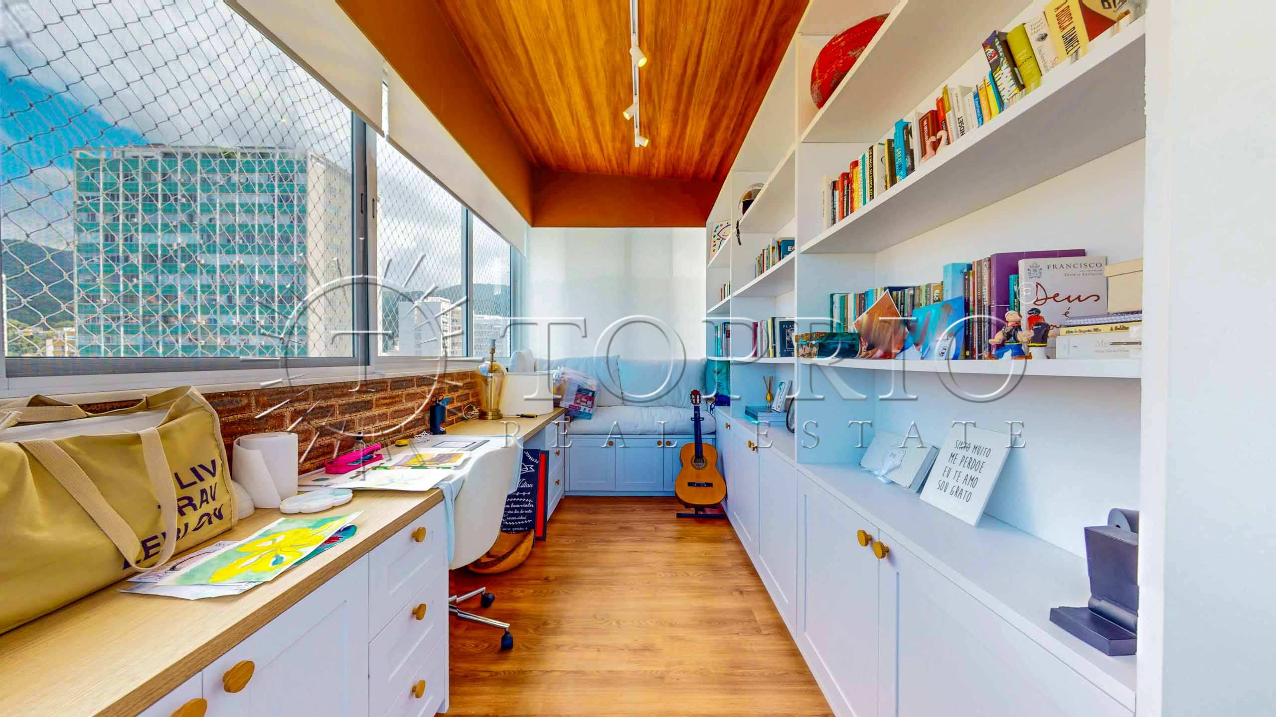 No terceiro pavimento, a cobertura oferece ainda mais versatilidade. A área de serviço possui armários e excelente circulação. Além disso, há uma dependência completa para funcionários. Por fim, uma suíte adicional — hoje utilizada como academia e escritório — complementa o piso, garantindo mais possibilidades de uso.