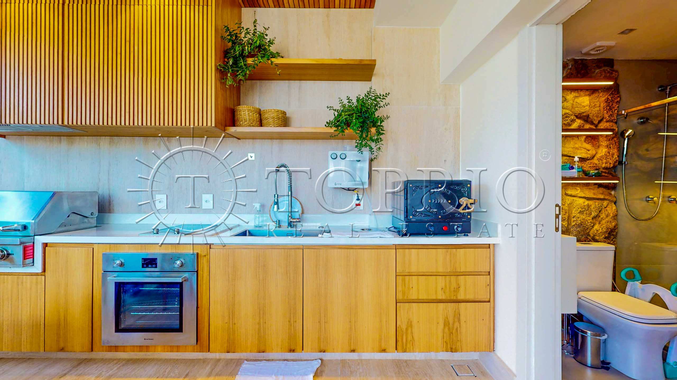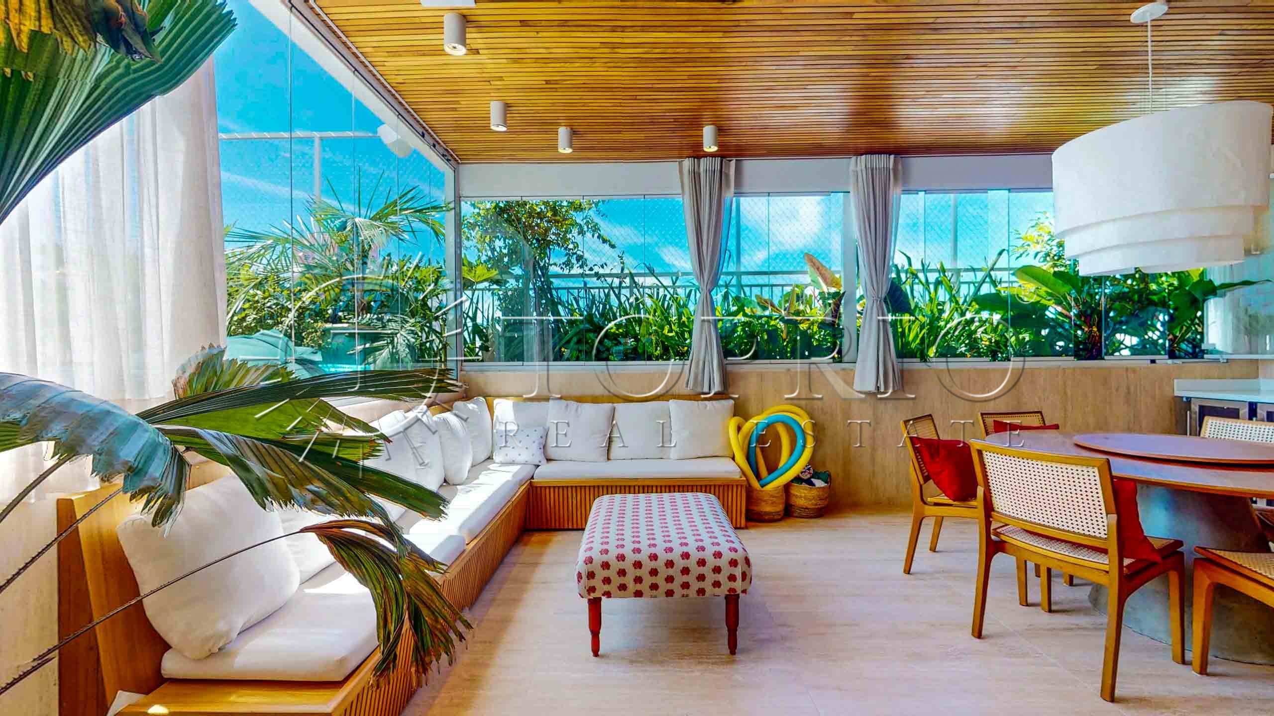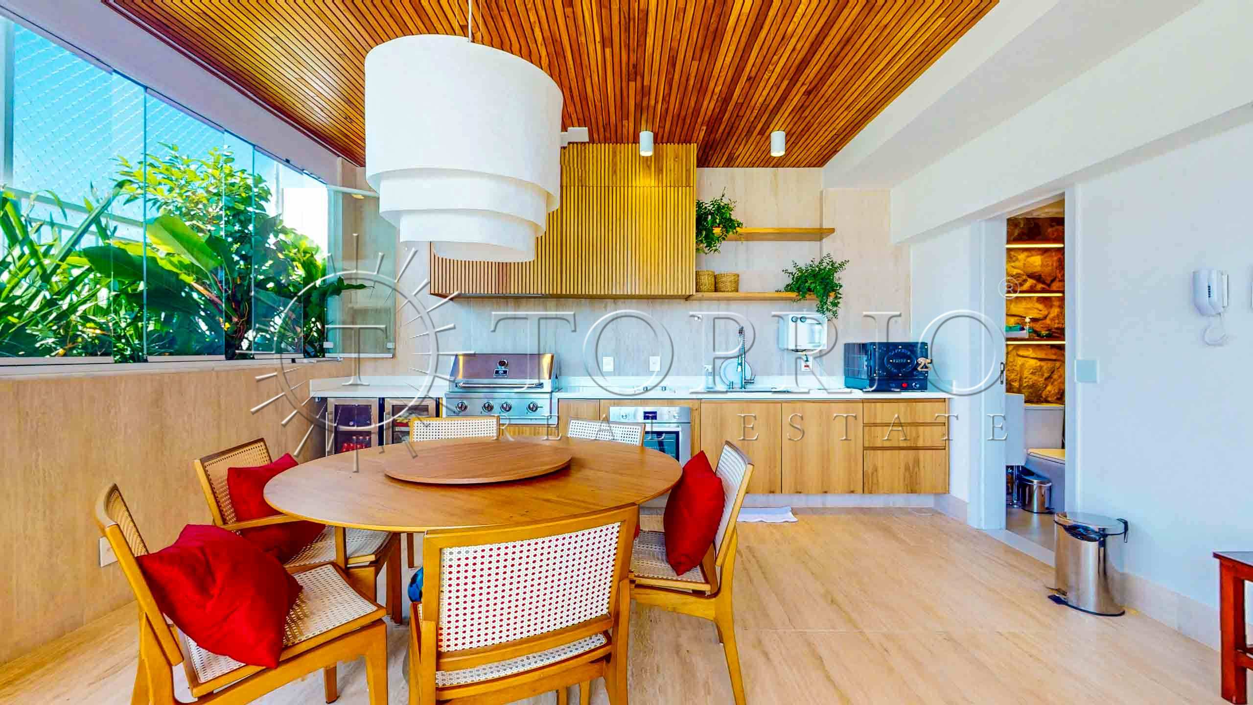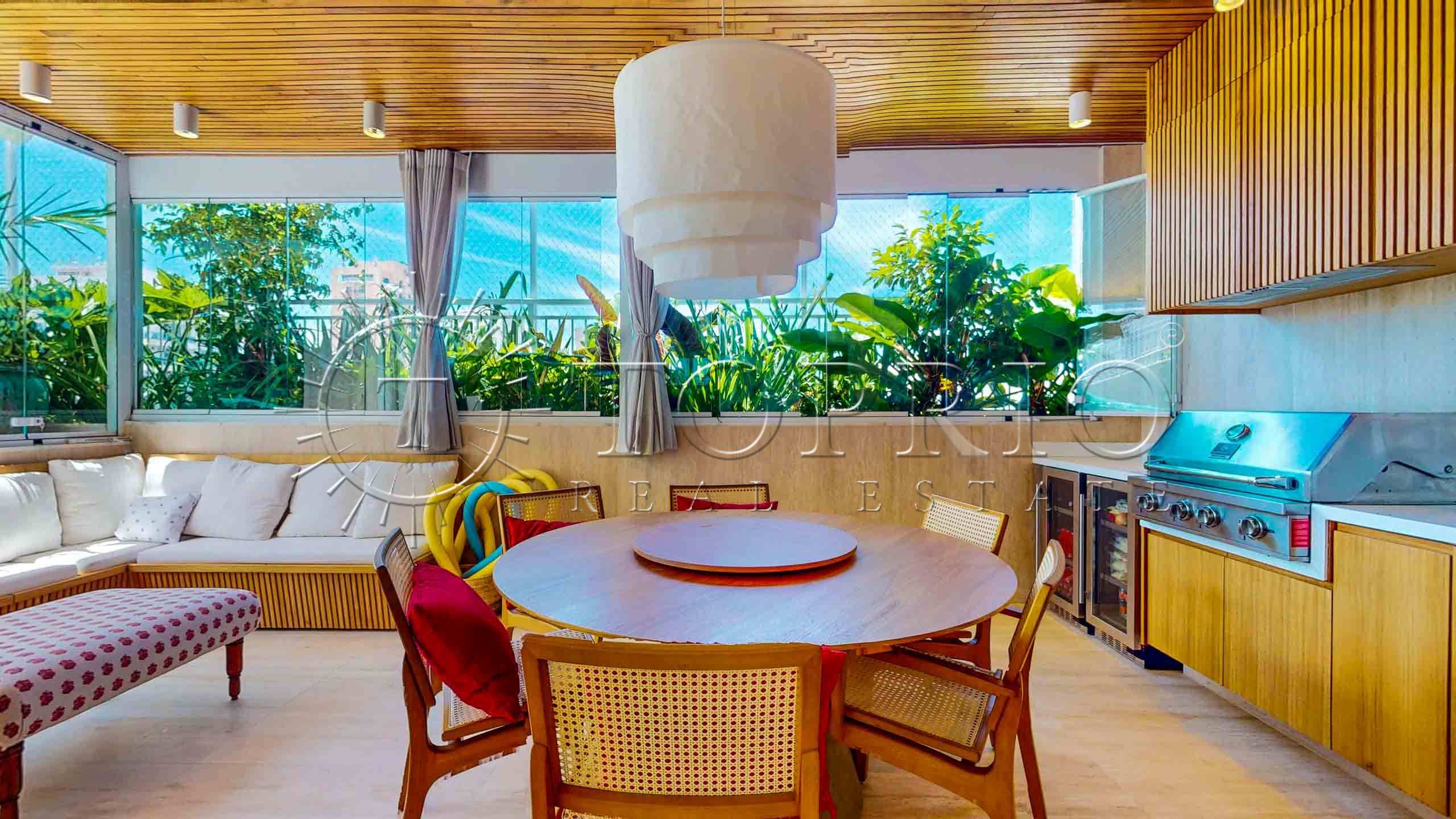 Enquanto isso, do outro lado do mesmo pavimento, está a área de lazer da cobertura, desenvolvida para receber convidados com muito conforto. Ela inclui: