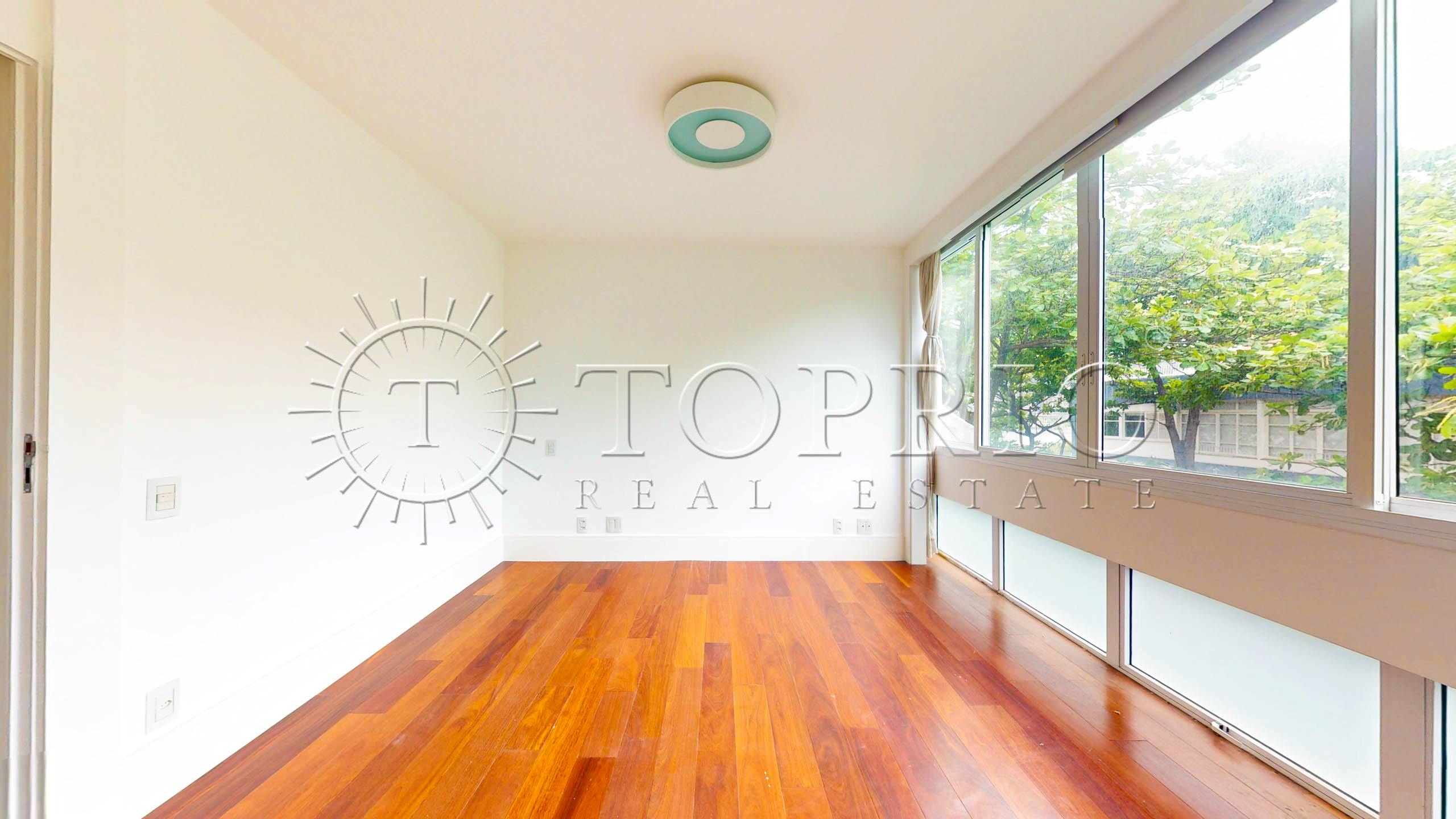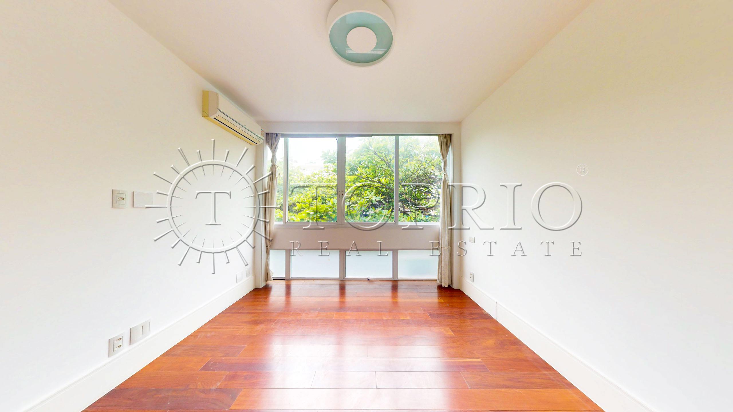 Descendo para o pavimento inferior, há uma sala privativa com pequena sacada e vista deslumbrante para a Lagoa Rodrigo de Freitas, ideal para leitura ou relaxamento.