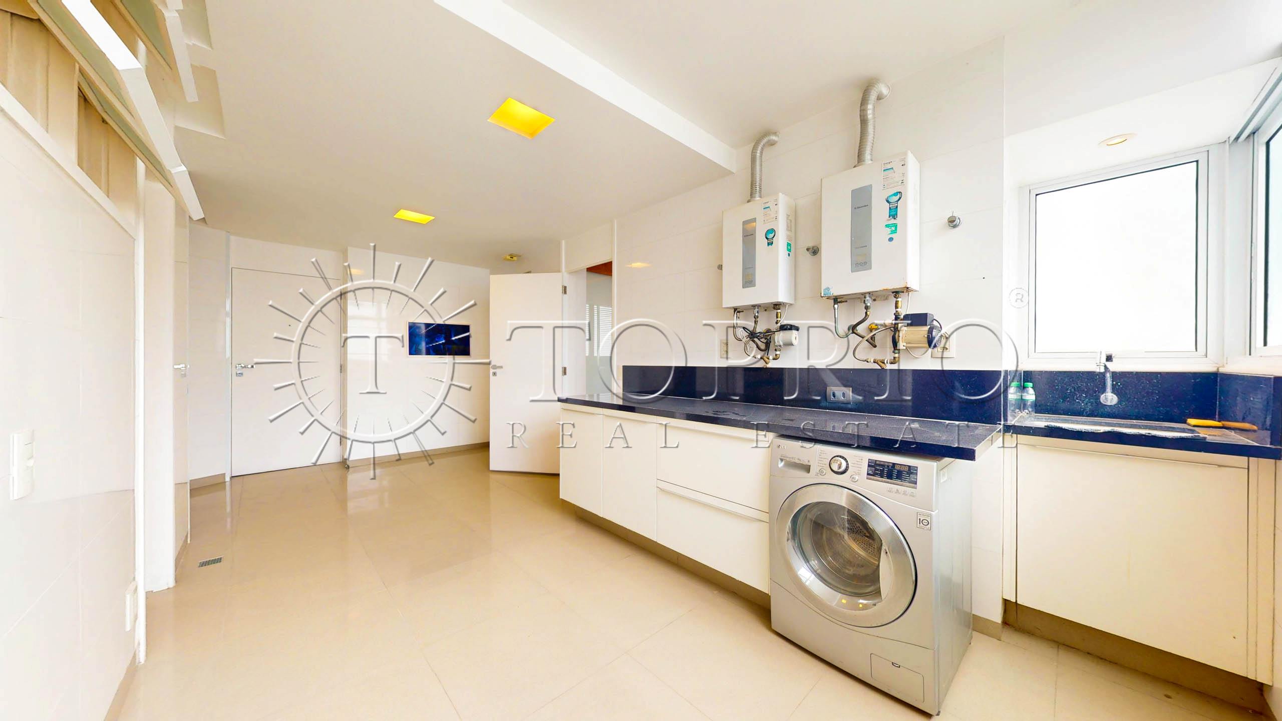 Em seguida, encontramos uma ampla área de serviço, lavanderia completa e duas dependências para funcionários, garantindo praticidade à rotina.